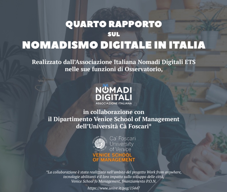 Frutto di due anni di ricerca interdisciplinare, il 4° Rapporto sul nomadismo digitale in Italia è realizzato dall'Associazione Italiana Nomadi Digitali ETS nell'ambito delle sue attività di Osservatorio, in collaborazione con i ricercatori della Venice School of Management dell'Università Ca' Foscari Venezia.